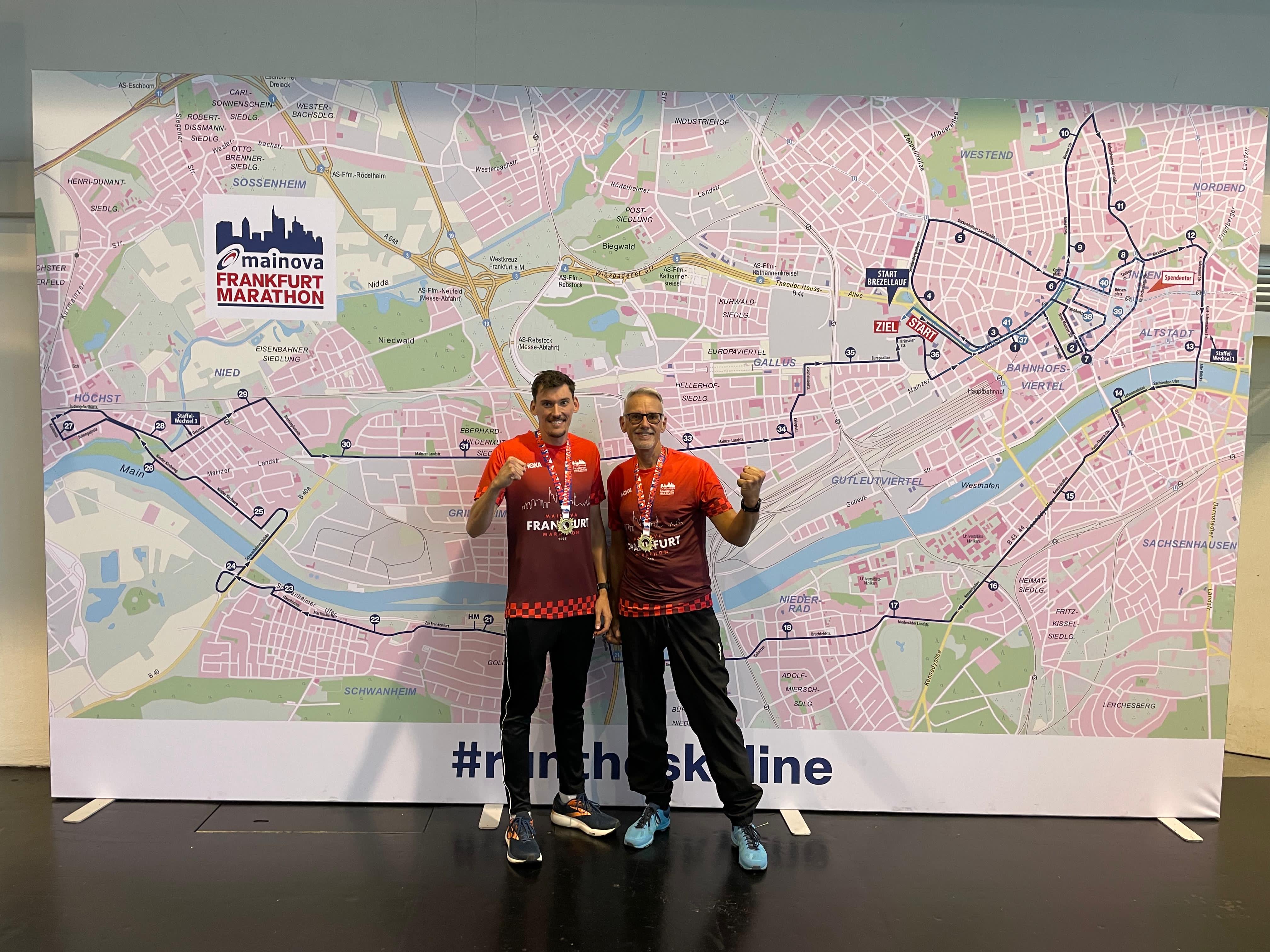... dann kommt manchmal ein gemeinsamer Marathon heraus. Unser Ironman Ralf Orth ging in den letzten Jahren als Vorbild voran, sein Sohn Marvin wollte nicht nachstehen und auch einmal einen Marathon laufen. Also entschlossen die beiden sich gemeinsam vorzubereiten und beim Frankfurter Marathon an den Start zu gehen. In der Vorbereitung tat sich Marvin bei den längeren Läufen öfters schwer. Ralf hatte hier die größere Erfahrung und steckte die Strecken jenseits der 30 km schon besser weg.
