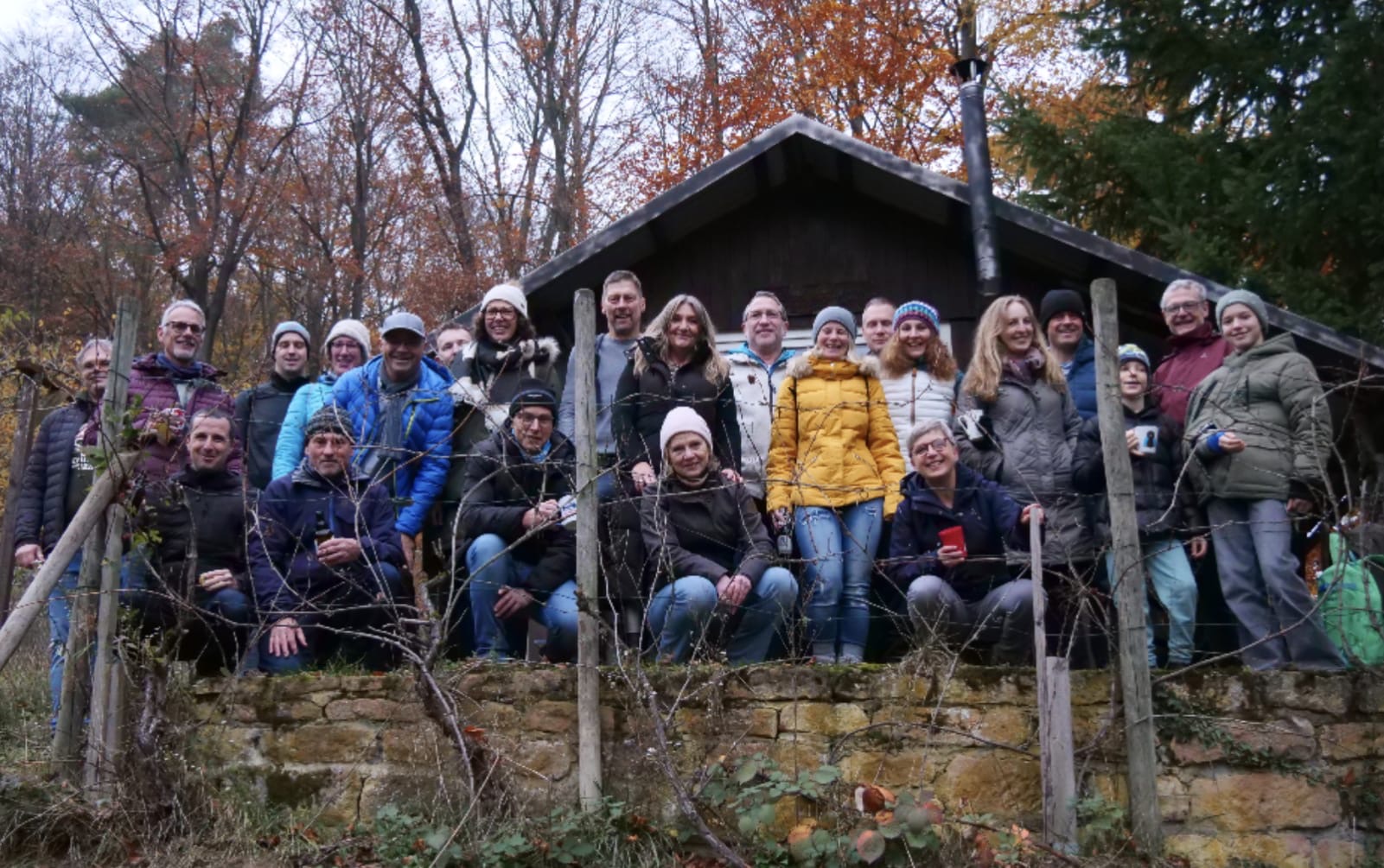 Dort wurde der ein oder andere Einheimische interviewt. Außerdem gab Norbert unterwegs Einblicke in die historische Vergangenheit des Berges mit Vulkan und Basalt Geschichten. Das war wie immer sehr interessant. Danach hatten Doris, Edith und Yvi einen Umtrunk und kleine Snacks an Herdts Hütte organisiert. Der Glühwein und das Bier kamen den Wanderern sehr gelegen!