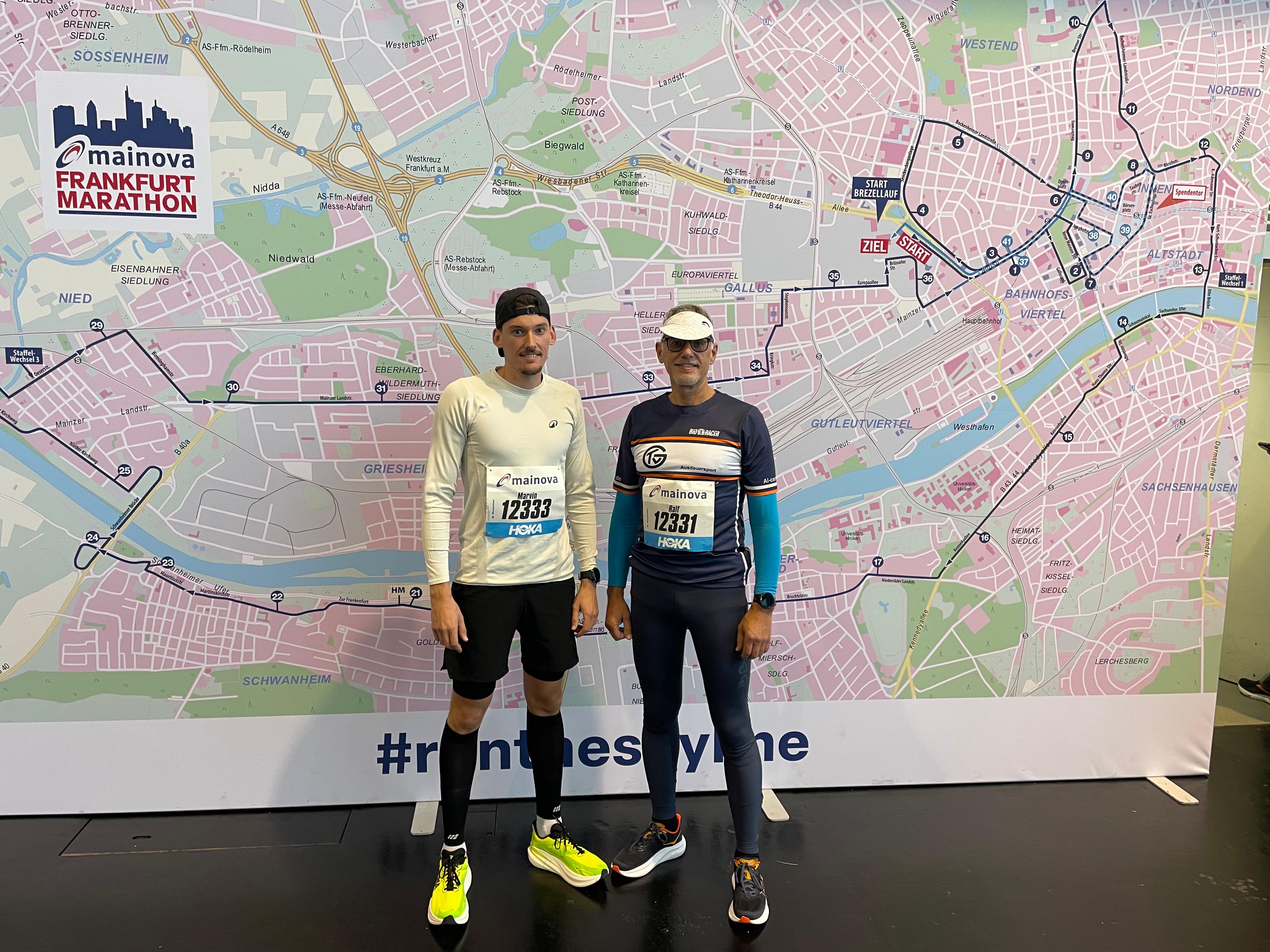 ... dann kommt manchmal ein gemeinsamer Marathon heraus. Unser Ironman Ralf Orth ging in den letzten Jahren als Vorbild voran, sein Sohn Marvin wollte nicht nachstehen und auch einmal einen Marathon laufen. Also entschlossen die beiden sich gemeinsam vorzubereiten und beim Frankfurter Marathon an den Start zu gehen. In der Vorbereitung tat sich Marvin bei den längeren Läufen öfters schwer. Ralf hatte hier die größere Erfahrung und steckte die Strecken jenseits der 30 km schon besser weg.