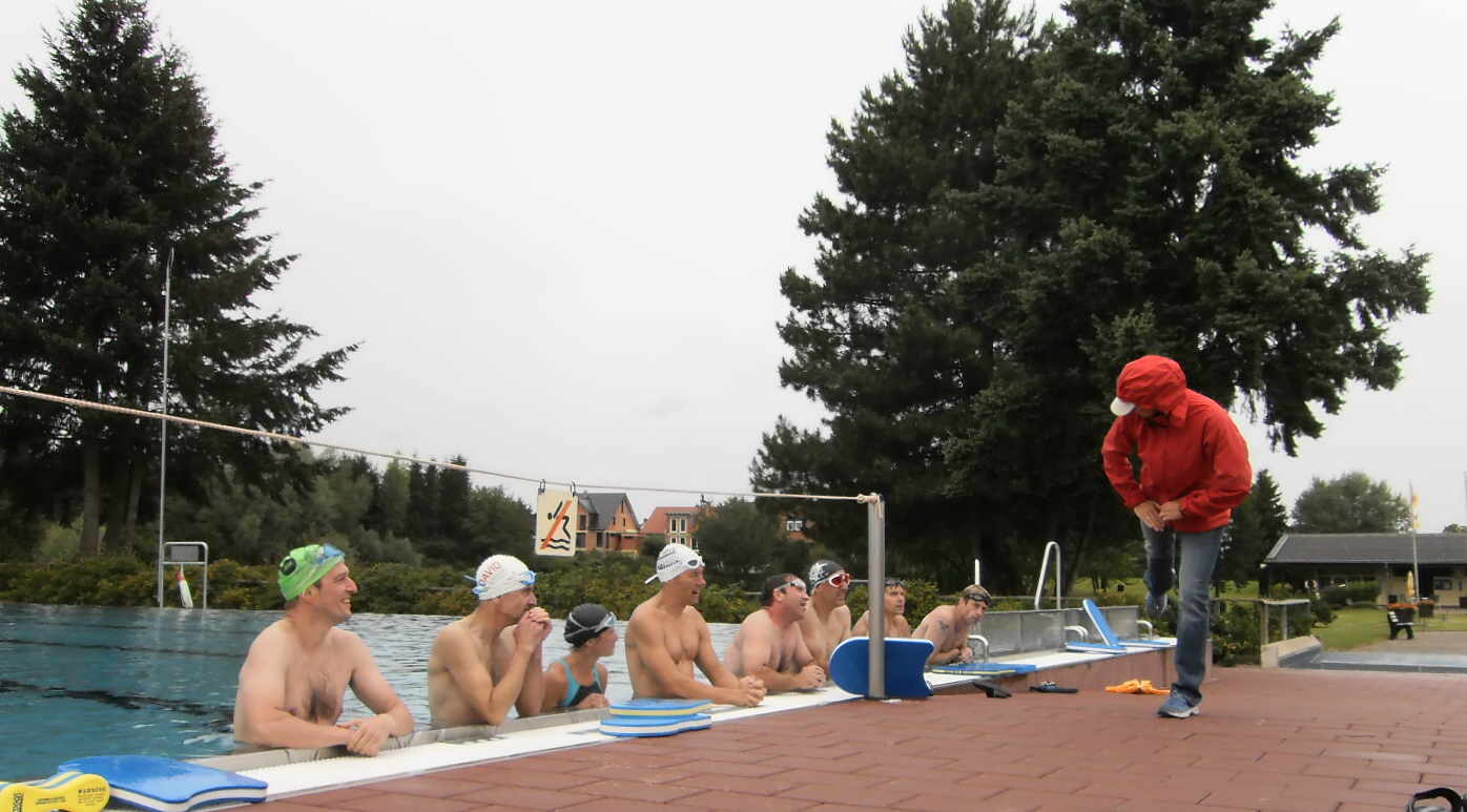 Nur drei sind es, die die Ruhe bewahren: na klar, Steffi, dann Jürgen am Aussichtsturm und natürlich Schwimmmeister Ferdinand. Der steht im warmen Trainingsanzug auf der Brücke und schüttelt in regelmäßigen Abständen den Kopf. Danke Ferdi, dass Du anschließend jedem von uns eine heiße Dusche ermöglicht hast. Jetzt sollen wir noch fleißig Hausaufgaben machen, und dann geht’s auf zum Honisch Beach. Danke Steffi für die vielen guten Tipps. Die zwei Minuten schneller in Niederberg gehen auf Dich!